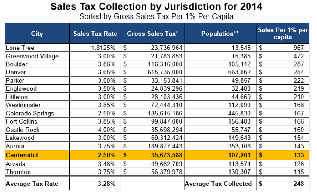 The City of Centennial continues to provide services on one of the lowest sales tax rates in the metropolitan area. Retail sales tax in Centennial is the largest source of revenue and represents approximately 53 percent of the total General Fund’s 2015 Budget. Centennial produces less sales tax revenue on a per capita basis compared to other jurisdictions with smaller populations and similar sales tax rates. It is a goal of the City through the Retail Market Analysis project to align competitively and capture more sales tax.
